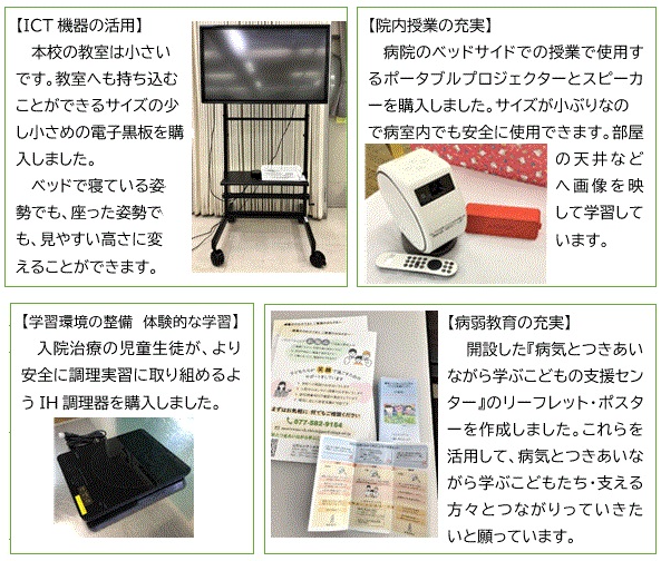 入院中の子どもたちのための病弱教育を推進する守山養護学校をはじめ、滋賀県の県立学校を応援していただける方は、ふるさと納税へのご協力をよろしくお願いいたします。