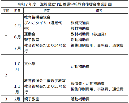 守山養護学校には、児童生徒の入退院による転出入が頻繁なためPTA組織はなく、教育後援会があります。教育後援会は、日々の学習活動に対して何らかの形で援助や支援をしたいと考えております。今後も皆様の絶大なご支援をお願いしたいと思います。