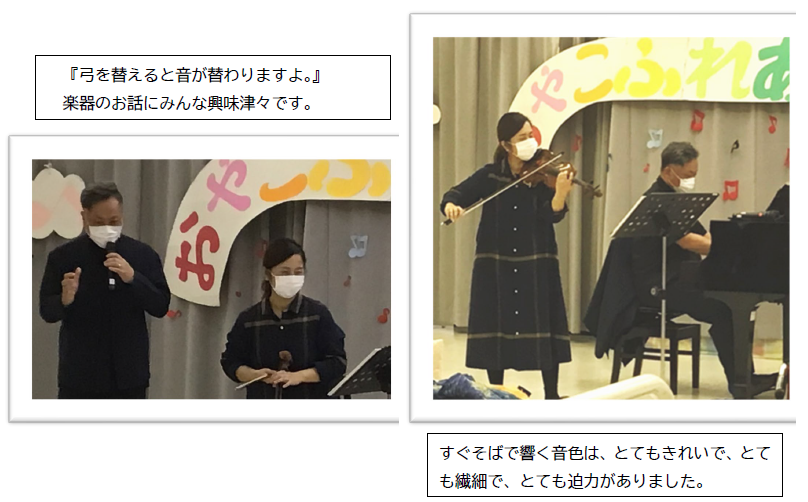 12月3日(水)は、ピアニスト萩原吉樹さん、ヴァイオリニスト西川茉利奈さんをお招きし、親子ふれあいコンサートを行いました。